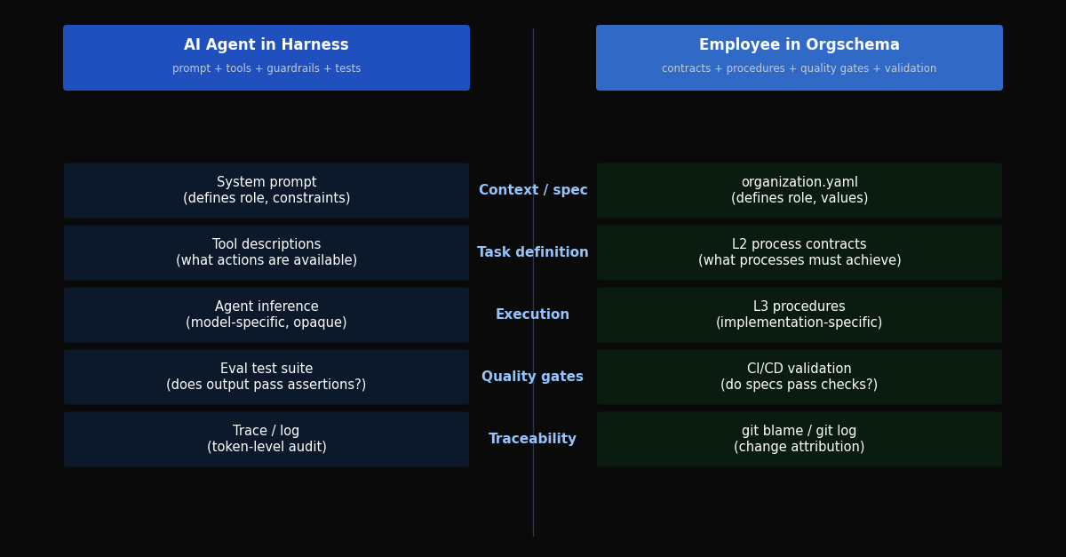 AI agent harness versus employee in orgschema: parallel structure of context, task definition, execution, quality gates, and traceability.